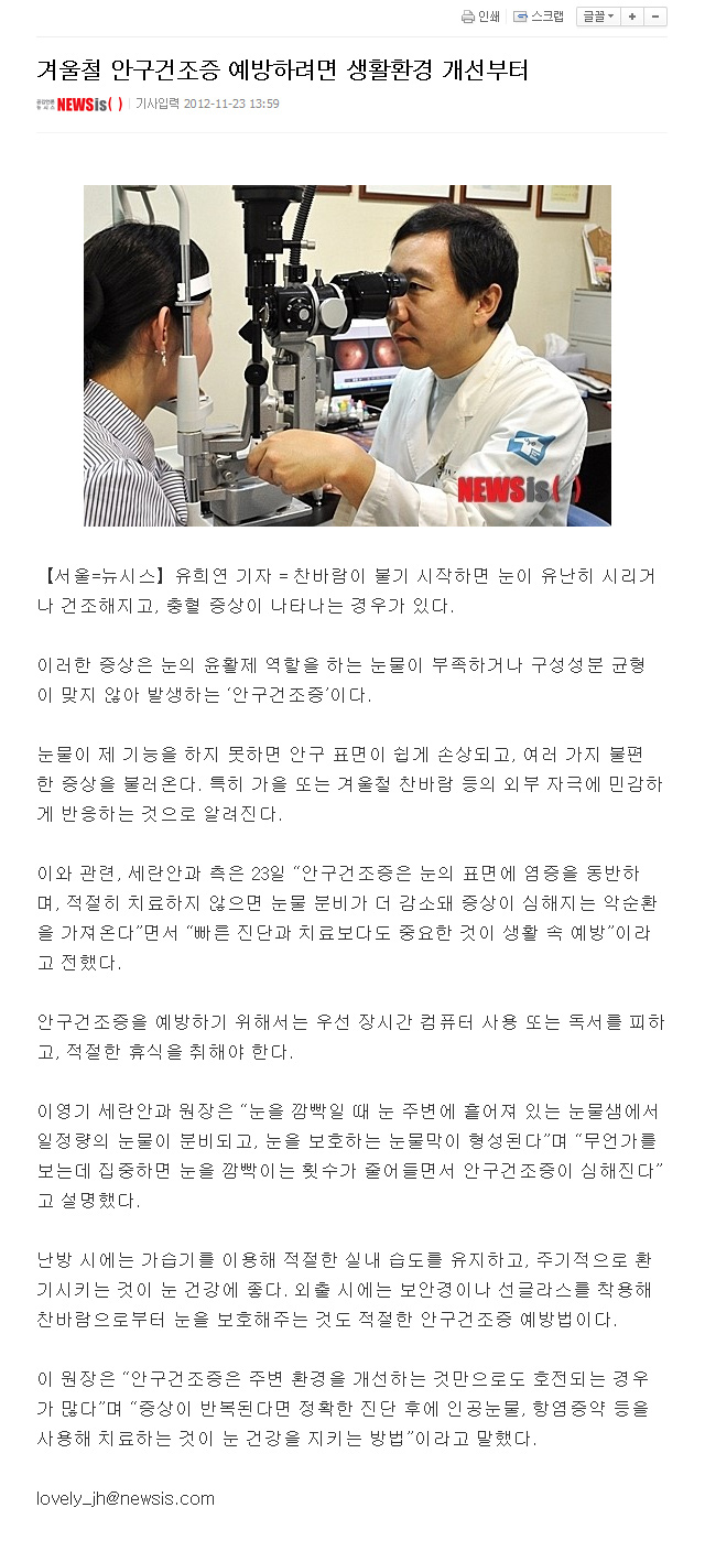 [뉴시스]겨울철 안구건조증 예방하려면 생활환경 개선부터 - 언론보도