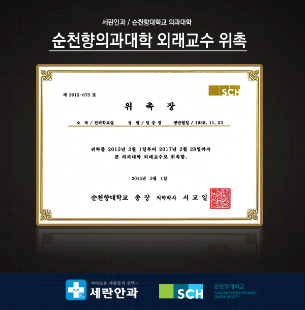 세란안과 임승정원장님께서 순천향대학교 의과대학 외래교수로 위촉되셨습니다.