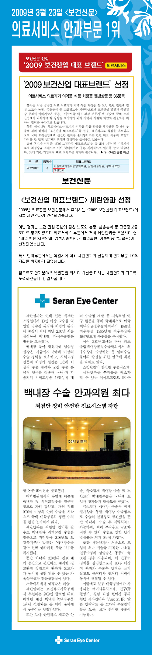 [보건신문] 2009 보건산업 대표브랜드 선정 - 병원소식